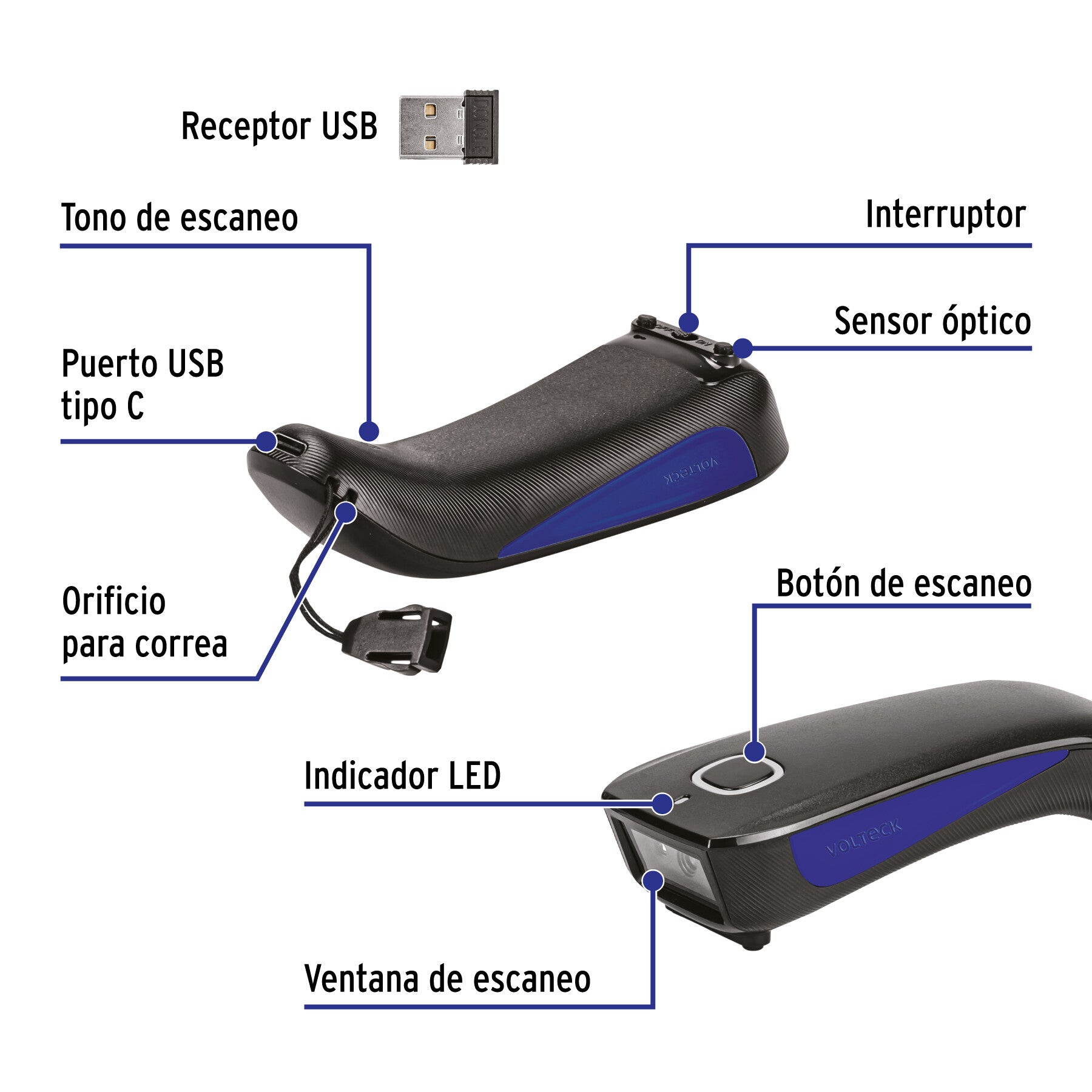 Lector de codigos de barra 2D bluetooth VOLTEK recargable, escanea hasta 1000 veces carga completa.